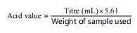 Determination of acid value: After 25 mL diethyl ether was mixed with 25 mL alcohol and 1 mL phenolphthalein (1%) and carefully neutralized with 0.1 M, NaOH. It was dissolved with 1-10 g of the oil or melted fat in the mixed neutral solvent and titrated with aqueous 0.1 M of NaOH shaking constantly until pink color which persisted for 15 sec was obtained6: