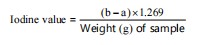 Determination of iodine value: The oil was poured into a small beaker, and a small rod was added. A suitable quantity of the sample was weighed out into a dry glass-stoppered bottle of about 250 mL capacity. The approximate weight in g of the oil to be taken was calculated by dividing 20 by the highest expected iodine value6.