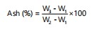 Ash determination: Ash represents the inorganic remains after the organic carbonaceous portion and other volatile components have been oxidized and evaporated away. An empty crucible was fire-polished in a muffle furnace and allowed to cool in a desiccator containing calcium chloride for 20 min and then weighed (W1). The samples (2 g each) were weighed into separate crucibles (W2) transferred into a muffle furnace and heated at 550°C until the sample was completely ashed, the crucible was removed and a drop of water was added to expose the unashed portion. The crucible was placed back in the muffle furnace and heated for 30 min more. This was removed and allowed to cool in a desiccator after which the crucible with the ash was weighed (W3)6: