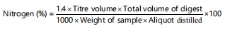 Crude protein determination: The crude protein content of the samples was determined using the Microkjeldahl method of AOAC6. The samples were digested with concentrated sulphuric acid, using copper sulfate and sodium sulfate as the catalyst to convert organic nitrogen to ammonium ions. Alkali was added and the liberated ammonia was distilled into an excess boric acid. The distillate was titrated with hydrochloric acid or sulphuric acid.