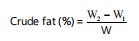 Crude fat determination: The crude fat was determined using the Soxhlet extraction method of AOAC6. A 250 mL fit round bottom flask was washed and dried in an oven for about 25 min and allowed to cool in a desiccator before it was weighed (W1). Five grams of the sample was weighed (W) and wrapped in a thimble. This thimble and its content were inserted into the extraction column with the condenser. About 350 mL of the extracting solvent (n-hexane) was poured into the round bottom flask and fitted into the extraction unit. The flask was heated with the aid of an electrothermal heater at 60°C. Losses of solvent due to heating were checked with the aid of the condenser so that it cooled and refluxed the evaporated solvent. After extraction, the thimble was removed and the solvent was salvaged by distillation. The flask and its content were placed in a water bath to evaporate off the solvent. The flask and the residue were transferred to an oven and heated for some minutes to evaporate the remaining solvent and moisture to complete dryness. It was cooled in a desiccator and weighed (W2)6:
