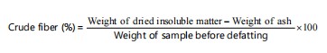 Crude fiber determination: The crude fiber was determined using the gravimetric methods as described AOAC6. The crude fiber method gives an estimation of insoluble and indigestible food residue which remains after which the sample has been treated under prescribed conditions. It was determined by consecutive treatment with light petroleum, boiling dilute sulphuric acid, boiling dilute NaOH, dilute HCl, alcohol, and ether. The insoluble residue was collected by filtration, dried, weighed, and ashed to collect mineral contamination.