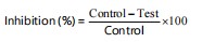 Nitric oxide scavenging activity: The extent of inhibition of nitric oxide radical generation in vitro following the method reported by Green et al.10. Sodium nitroprusside in aqueous solution, at physiological PH, spontaneously generates nitric oxide, which interacts with oxygen to produce nitrite ions that are estimated with a spectrophotometer at 546 nm. The reagents used were sodium nitroprusside (100 Mm), phosphate buffered saline (PH 7.4), griess reagent 1%, sulphanilamide, 2% H3PO4, and 0.1% naphthylethylene diamine dihydrochloride.