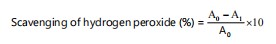 Hydrogen peroxide scavenging effects: The ability of the leaf samples to scavenge hydrogen peroxide was assessed using the reagents. Phosphate buffer (0.1 M, Ph 7.4) and H2O2 (40 Mm) in phosphate buffer. A solution of H2O2 (40 Mm) was prepared in phosphate buffer. Leaf samples at the concentration of 10 mg/10 μL were added to the H2O2 solution (0.6 mL) and the total volume was made up to 3 mL. The absorbance of the reaction mixture was recorded at 230 nm in a spectrophotometer (Genesys 10-S, USA).