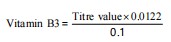 Determination of Vitamin B3 (Nicotinamide): Five gram of the sample were dissolved in 20 mL of anhydrous glacial acetic acid and warmed slightly, 5 mL of acetic anhydride were added and mixed. About 2-3 drops of crystal violet solution were added as the indicator, and titrated with 0.1 M perchloric acid to a greenish-blue colour6: