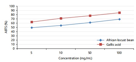 ABTS: The graph of the ABTS antioxidant activity of Parkia biglobosa extract compared to the ABTS antioxidant activity of the gallic acid shows that the African locust bean extract had higher ABTS activity than the gallic acid in Fig. 1. This exposes the locust bean as a potent antioxidant.