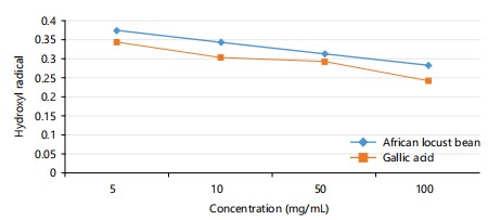 Hydroxyl radical: The graph in Fig. 2, shows the hydroxyl radical antioxidant activity of Parkia biglobosa is higher compared to the activity of the gallic acid. This shows the locust bean is a more potent antioxidant.