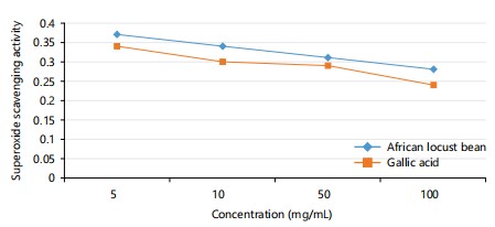 Super peroxide scavenging activity: The graph shows the super peroxide scavenging activity of Parkia biglobosa to be higher compared to the activity of the gallic acid in Fig. 3. This shows the locust bean is a more potent antioxidant.