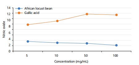 Nitric oxide: The graph shows the absorbance of nitric oxide in Parkia biglobosa and gallic acid at a particular concentration as seen in Fig. 4. The gallic acid has a higher concentration of nitric oxide than the locust bean.